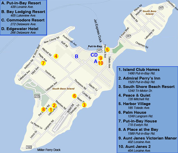 Once you are on the island, you will need to know where you are going! Below is a map showing the most popular Put-in-Bay lodging choices available. The map is broken down by Resort Hotels and Island Rental Homes. The landing spots for the island ferries are also shown. Depending on where you are going, you may wish to Rent a Golf Cart to get you to and fro. Golf Carts and Mopeds are the most popular forms of island transportation.